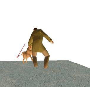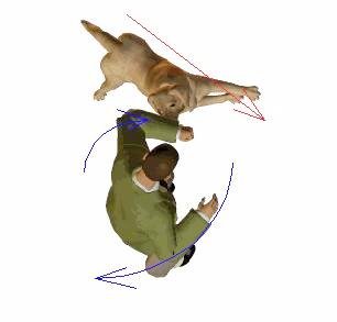 Собака по инерции пролетает мимо нас (рис 2). За счет инерции ее проносит как правило на пару метров. Иногда уводя руку получается удар локтем по морде, но особых преимуществ он не приносит и выполнить нокаутирующий удар таким образом не представляется реальным. Зачастую пропуск не удается выполнить совсем чисто и собака успевает прихватить руку - однако за счет вращательного движения телом и подкруткой рукой часто удается освободить ее - естественно поверхностные разрывы кожи и одежды у нас будут, но на это надо закладываться сразу и не обращать внимание. Может получиться, что собака зацепиться за одежду, но не за тело. Если ткань оказалась крепкой, по сути мы перейдем к варианту с отдачей в укус.
