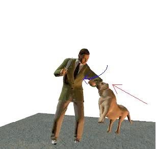 Ниже на рисунке показана достаточная стандартная ситуация - собака провела укус рукава, а человек пытается ударить ее ногой.