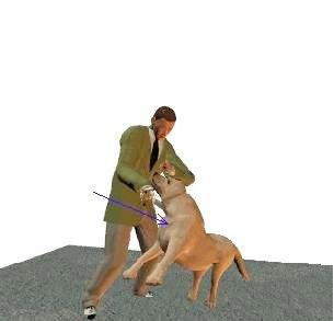 Некоторые собаки (средних и больших габаритов) обхватывают передними лапами ногу человека (как показано на рисунке красным кругом) , тем самым не давая ему свободно перемещаться. Синяя стрелка показывает направление в котором будет перемещаться собака, одновременно при этом выполняя 'трепку' В качестве контратаки в подобной ситуации прежде всего приходит в голову начать выполнять удары со свободной руки и ногами. Такие действия возможны, однако существуют определенные сложности связанные с тем, что собака не стоит на месте и активно сопротивляется.